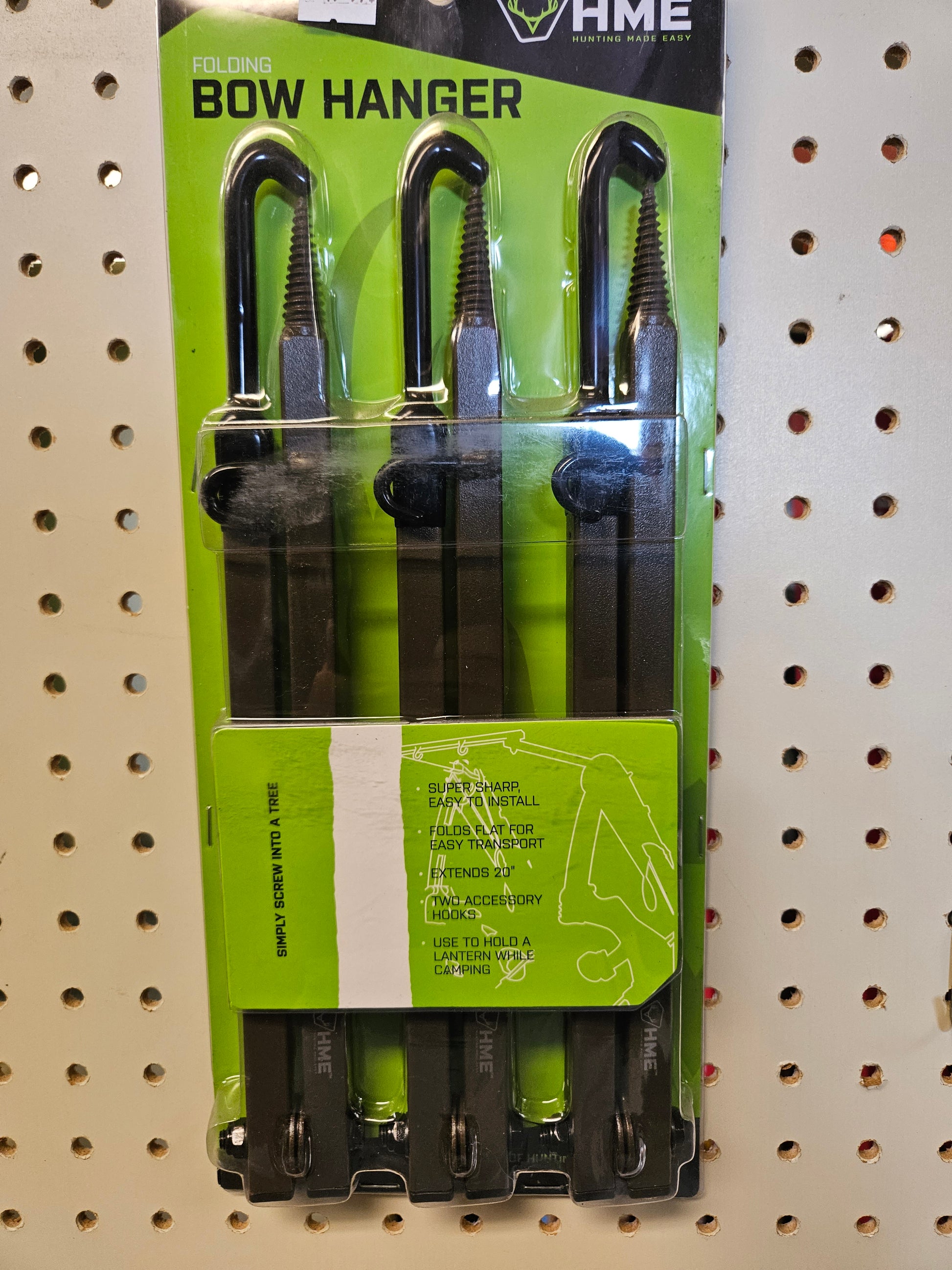 Perfect for treestand hunting, the HME™ Folding Bow Hangers deliver a plethora of convenient uses. Drive the hanger's super-strong and virtually unbreakable screw into a nearby tree to mount them. In moments, you'll have a place to hang your bow, and the arm's 2 accessory hooks are ideal for your pack, rangefinder, or anything else you want to keep in easy reach. The arm extends out to 20" and folds down to 10".