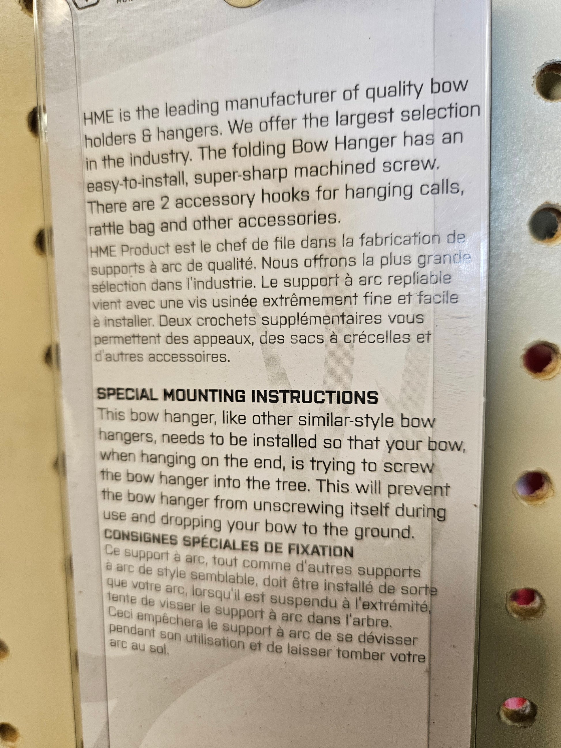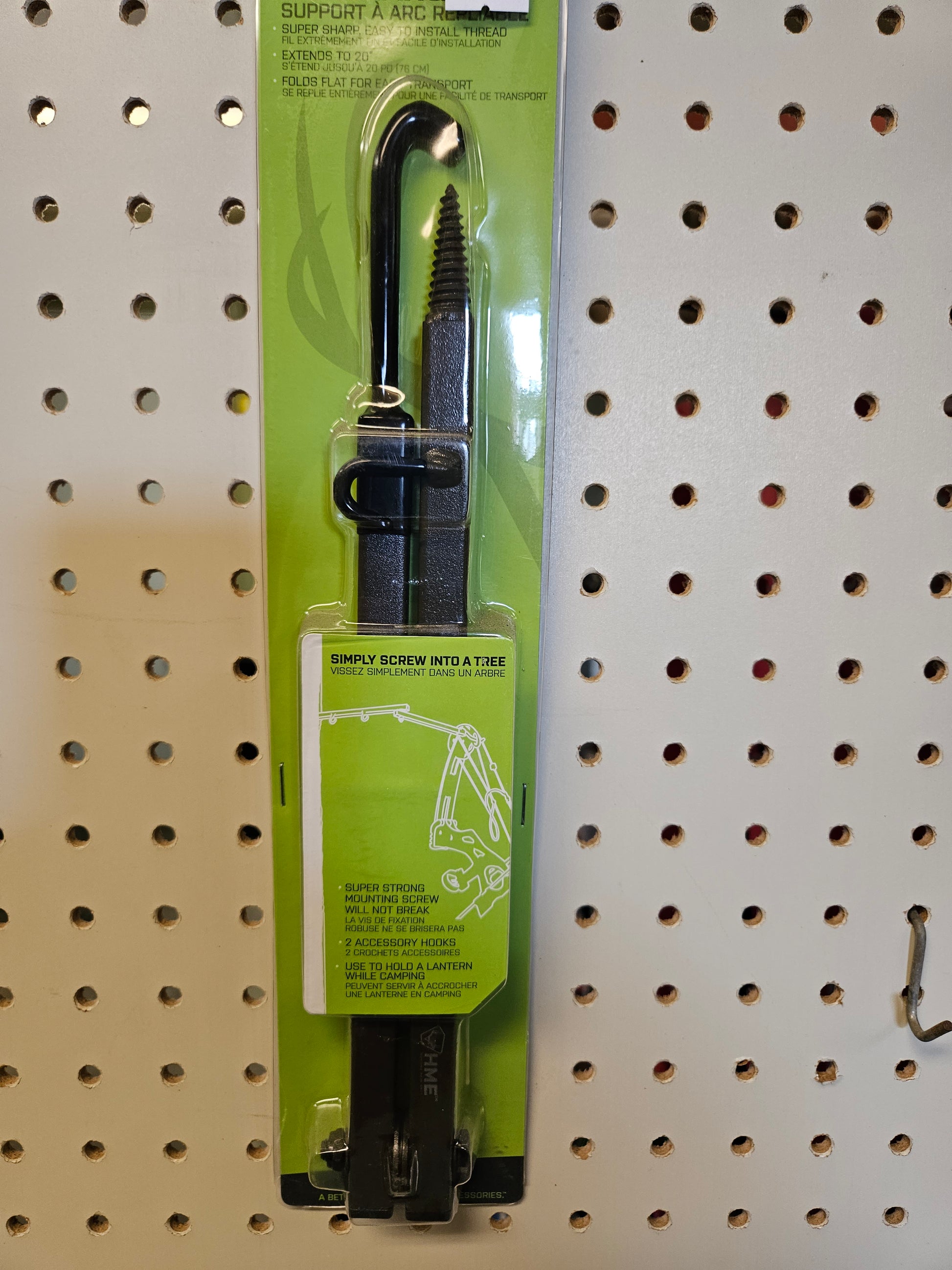 Perfect for treestand hunting, the HME™ Folding Bow Hanger deliver a plethora of convenient uses. Drive the hanger's super-strong and virtually unbreakable screw into a nearby tree to mount them. In moments, you'll have a place to hang your bow, and the arm's 2 accessory hooks are ideal for your pack, rangefinder, or anything else you want to keep in easy reach. The arm extends out to 20" and folds down to 10".